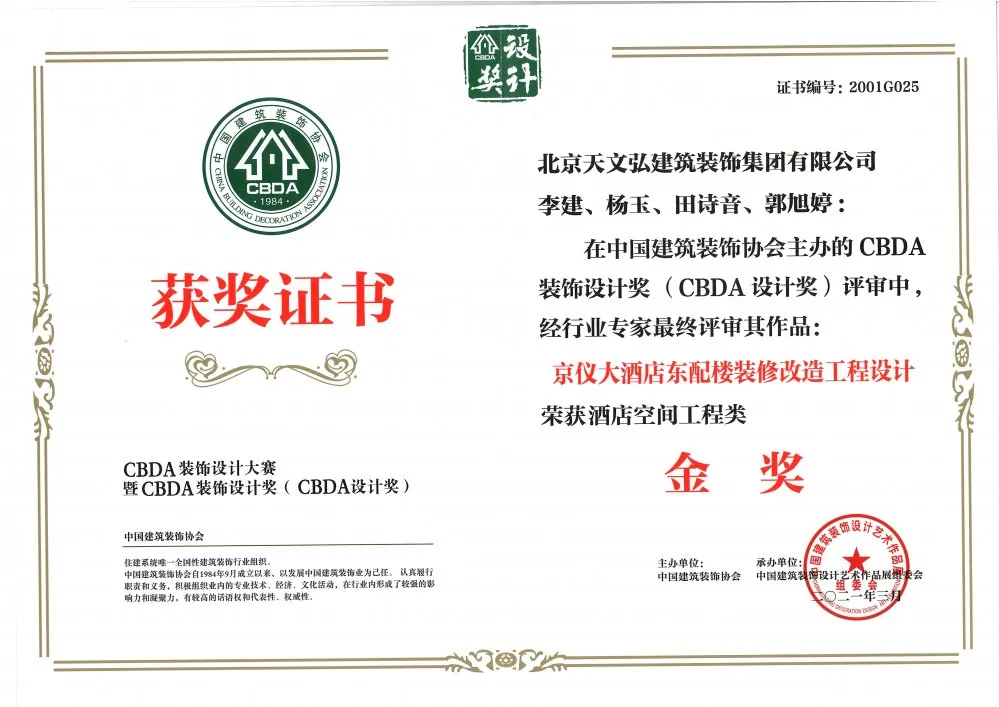恭喜我司設(shè)計團隊在中國建筑裝飾協(xié)會主辦的 CBDA裝飾設(shè)計獎評審中,經(jīng)行業(yè)專家最終評審其作品“京儀大酒店東配樓裝修改造工程設(shè)計榮獲酒店空間工程類金獎。